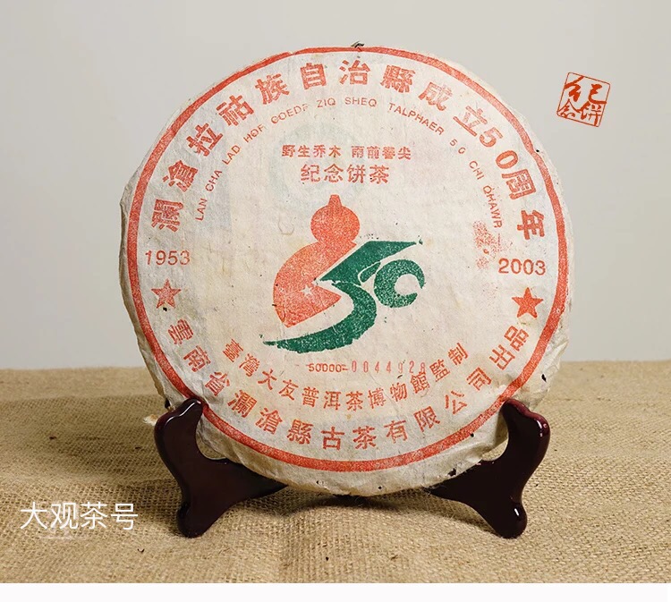 中期茶 > 2003年>2003年澜沧拉拉枯族自治县成立五十周年纪念饼 野生乔木 雨前春尖